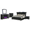 This striking bedroom set turns ordinary rest into a bold, illuminated escape. Wrapped in sleek black velvet, each piece is enhanced with integrated LED accents that cast a soft, modern glow. The dresser showcases a built-in flame visual display beneath a smooth tempered glass top and includes a wireless remote for effortless control. Complete with a tufted LED wingback bed, a solid rubberwood nightstand with dual USB ports, and a softly lit mirror, this collection blends dramatic style with upscale comfort.